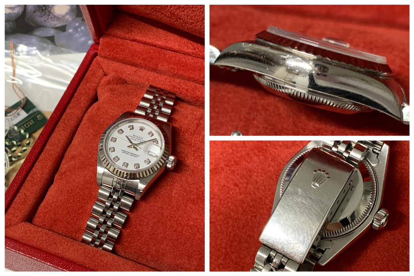 ロレックスの定番女性用腕時計、デイトジャストのお買取です。デイトジャストは長期にわたって製造されており、それぞれの年代ごとにディティールが違います。今回お買取したデイトジャストは、リファレンスナンバーが79174。1999年から2004年に製造されていたシリーズです。